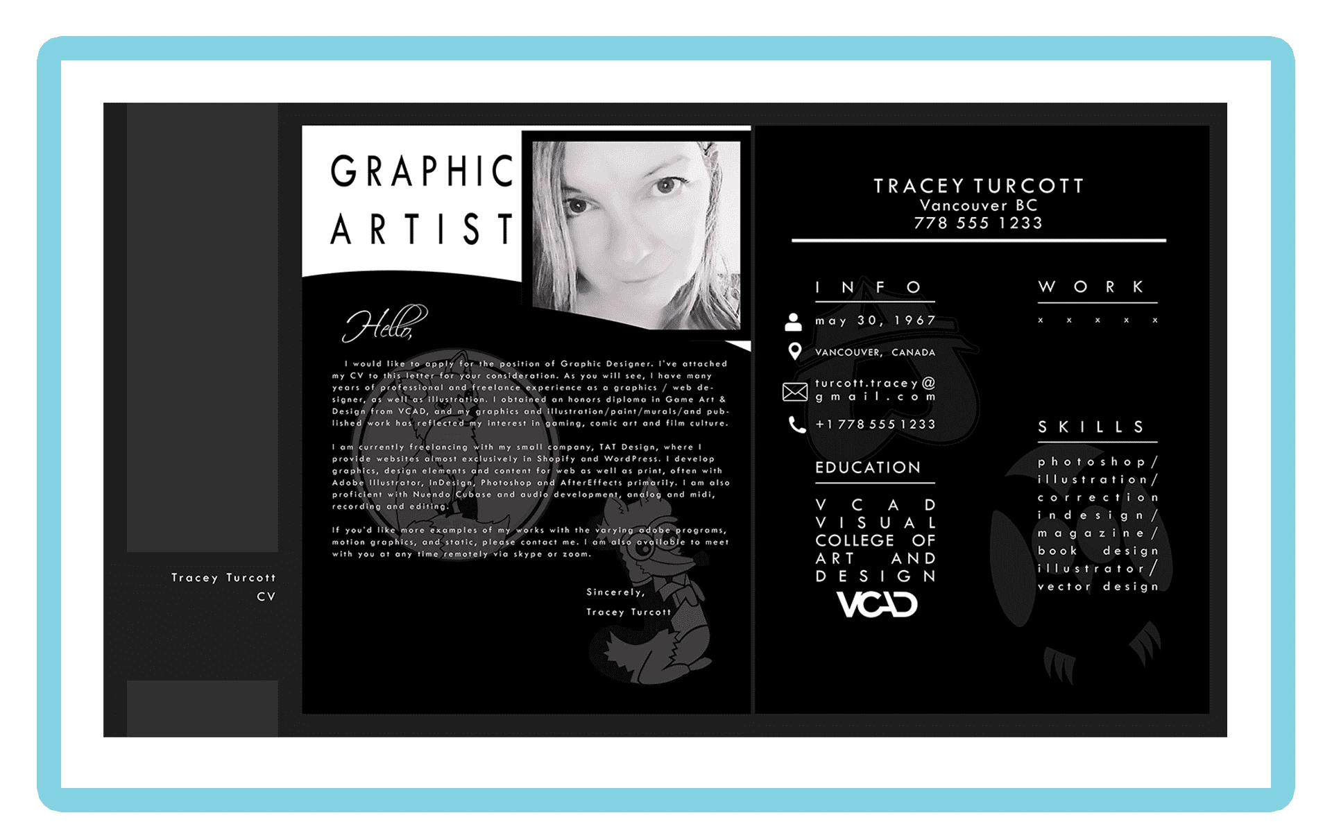 ABOUT Tracey Turcott Graphic DesignVancouver Hello, my name is Traceyand I’m the Principal Designer at TAT Design. I had a passion for Art and Photography at a very young age. When some years had passed I desired to branch out and explore more ‘Design’ creative avenues. This led me to study Graphic Design at VCAD. I’ve gained so much and am looking forward to creating for you. Check us out online for frequent updates andGet in touch!